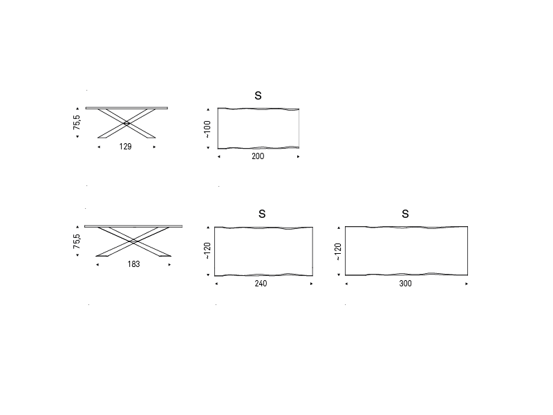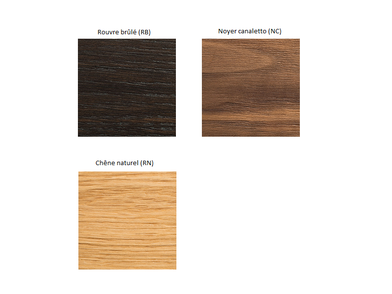 Version "S" avec bords irreguliers en bois massif noyer Canaletto (NC), rouvre brulé (RB) ou rouvre naturel (RN) en épaisseur 4 cm.