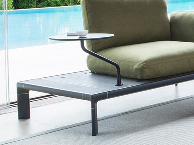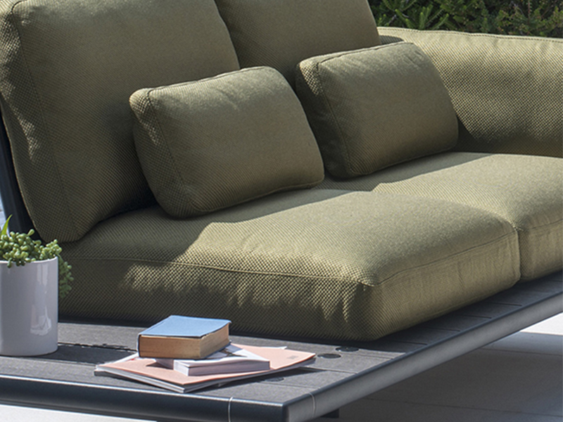 Le système de sièges Tami de Patrick Norguet permet également d'ajouter une table orientable à fixer sur la structure ainsi que des coussins décoratifs aux différents coloris.